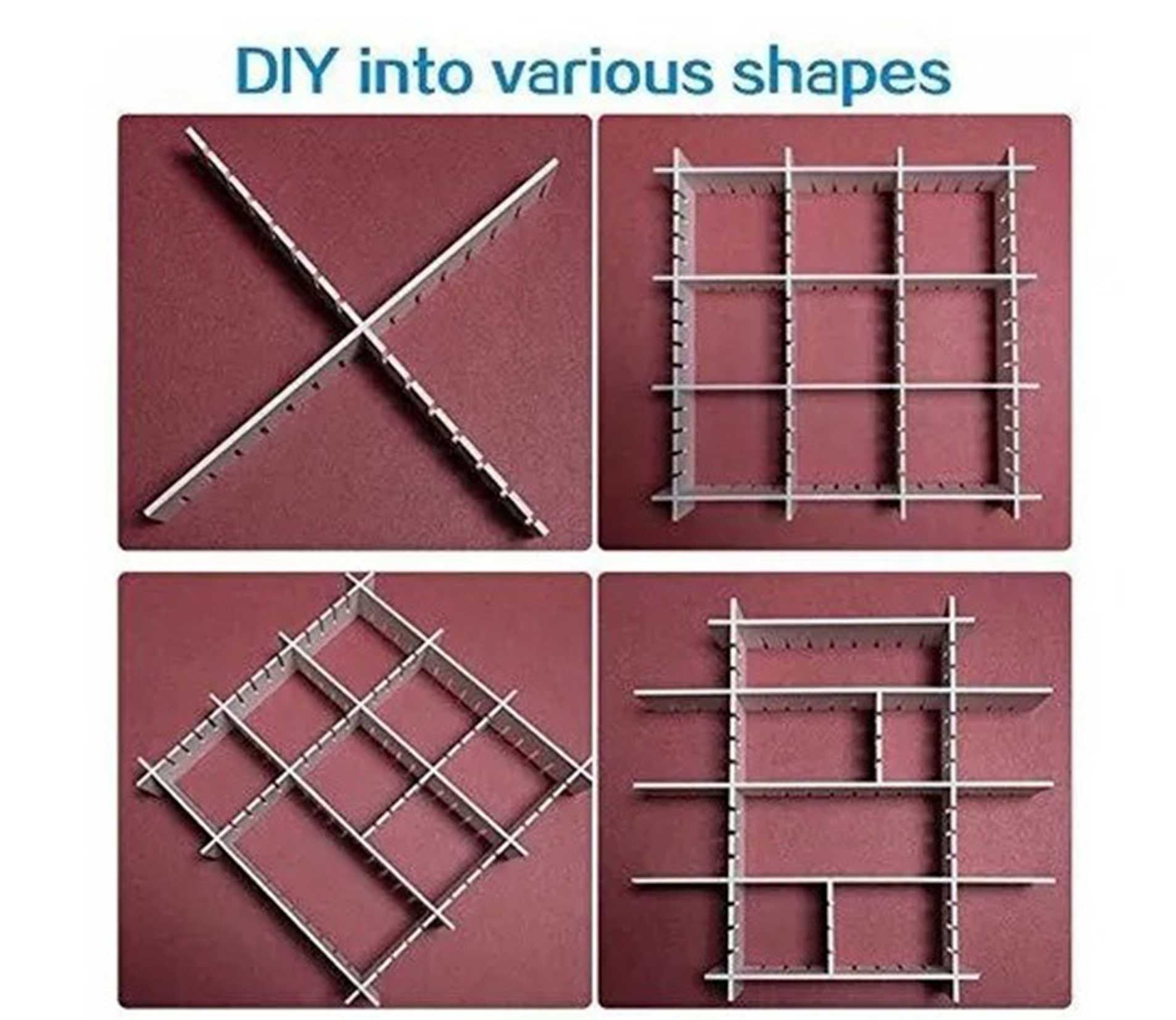 La forma de nuestras rejillas es muy versatil para que se ajusta a todas tus necesidades, permitiendo expandir o recortar los separadores a tu gusto y conseguir con ello las divisiones que necesites para encontrar tus cosas mucho más rápido.